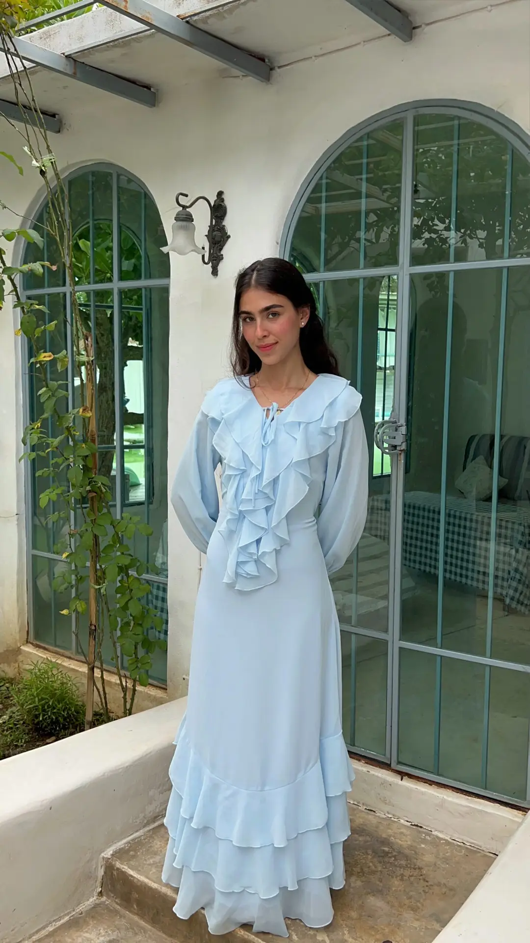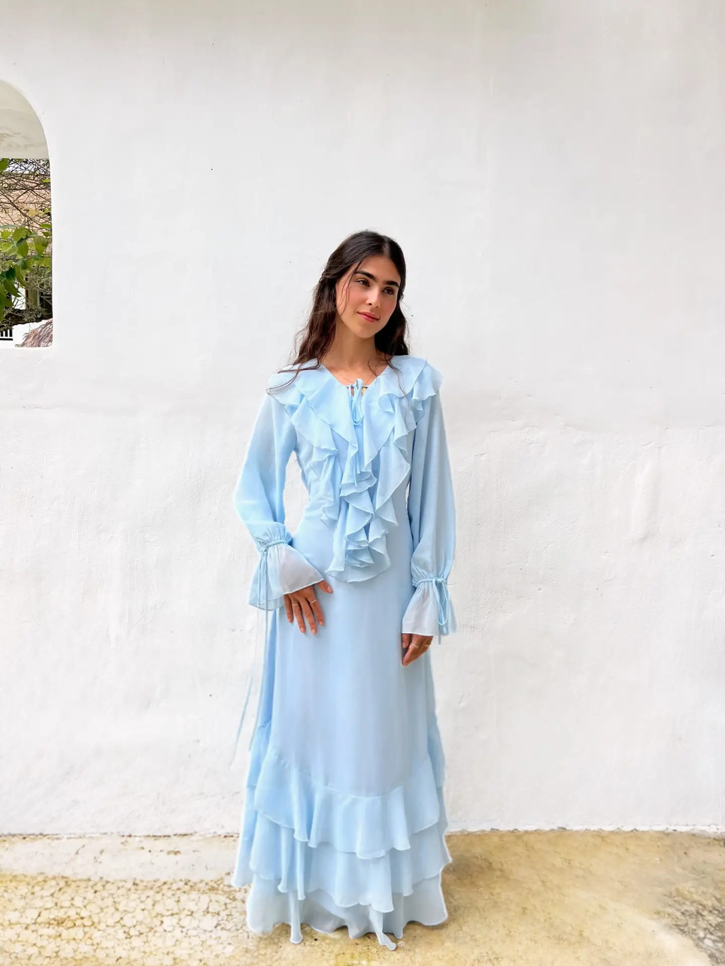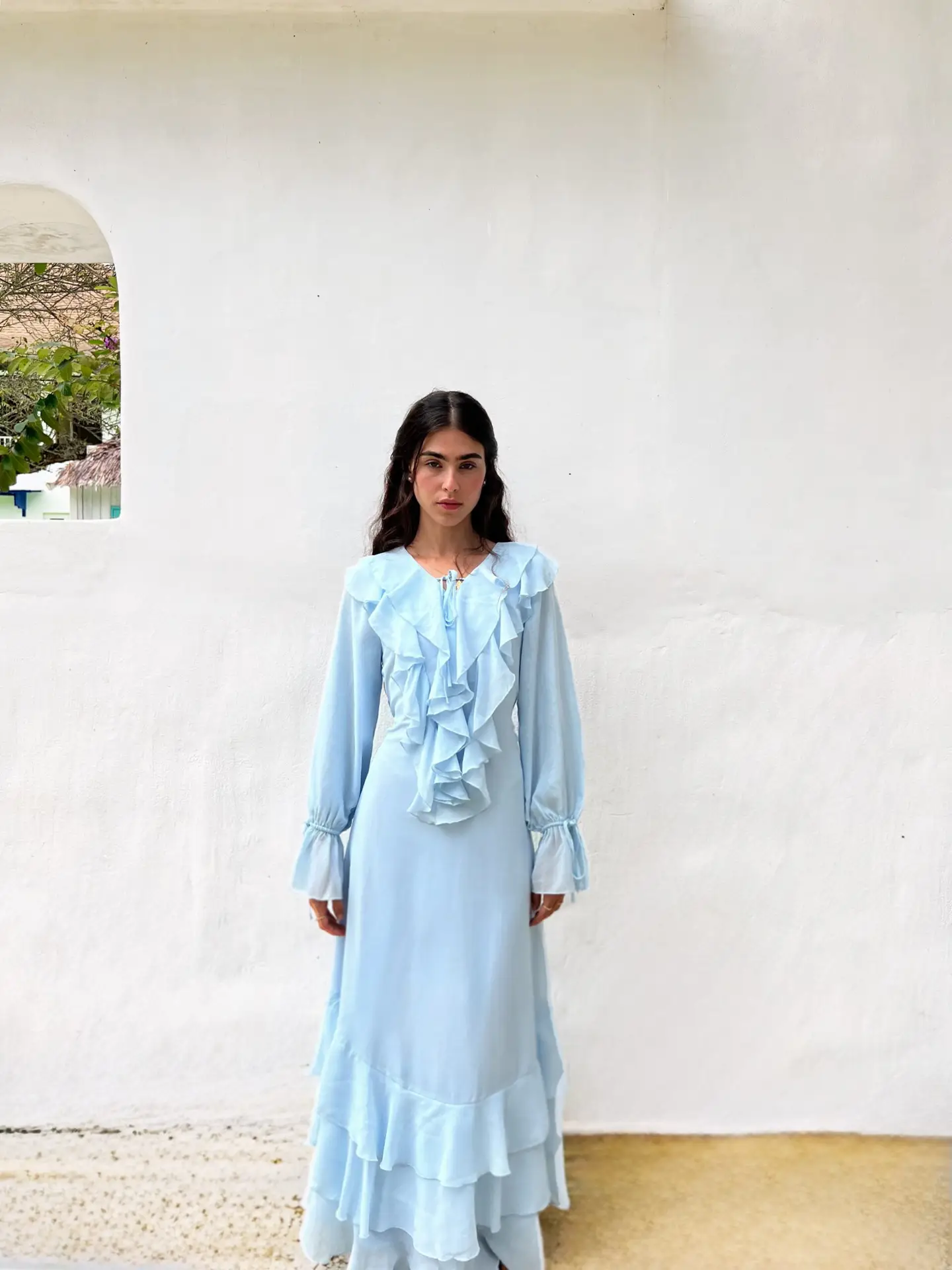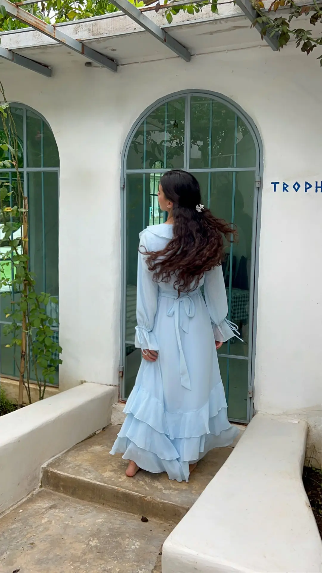 השמלה בגזרה משוחררת ונשפכת, עם מלמלות עדינות בחזה ובתחתית שמוסיפות תנועה ורוך, וקשירה יפהפייה בשרוולים.