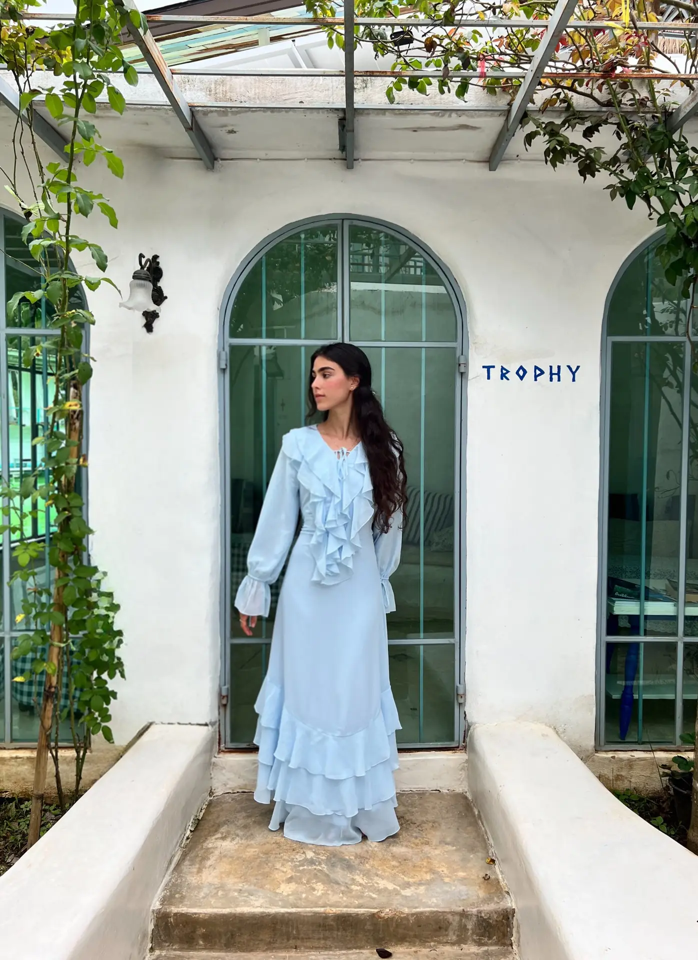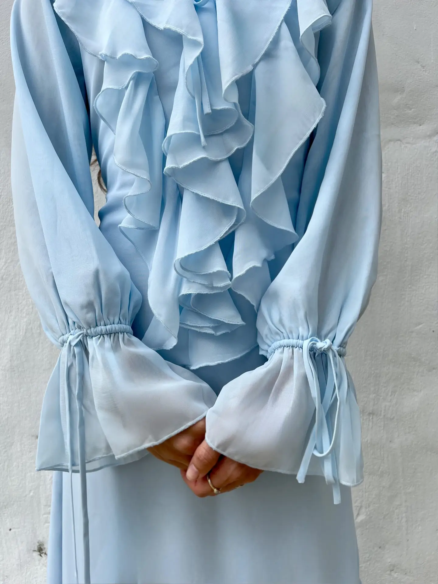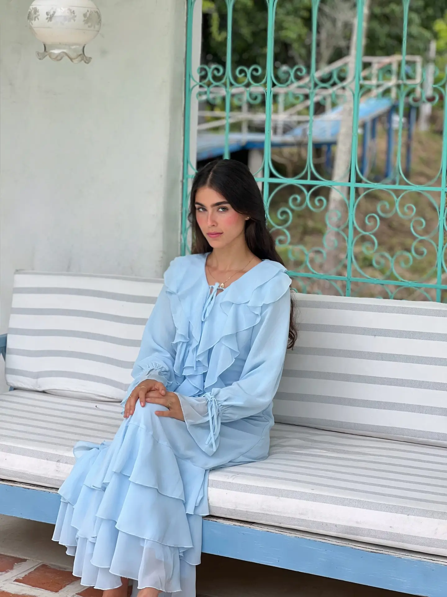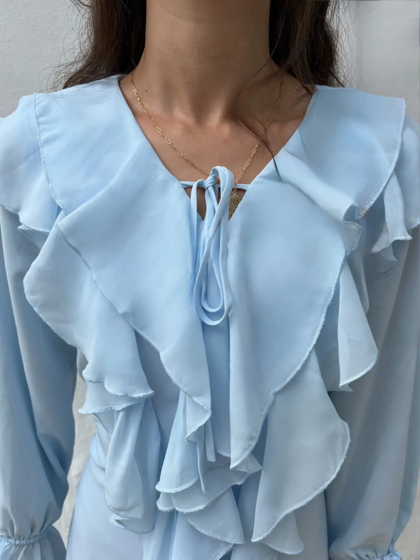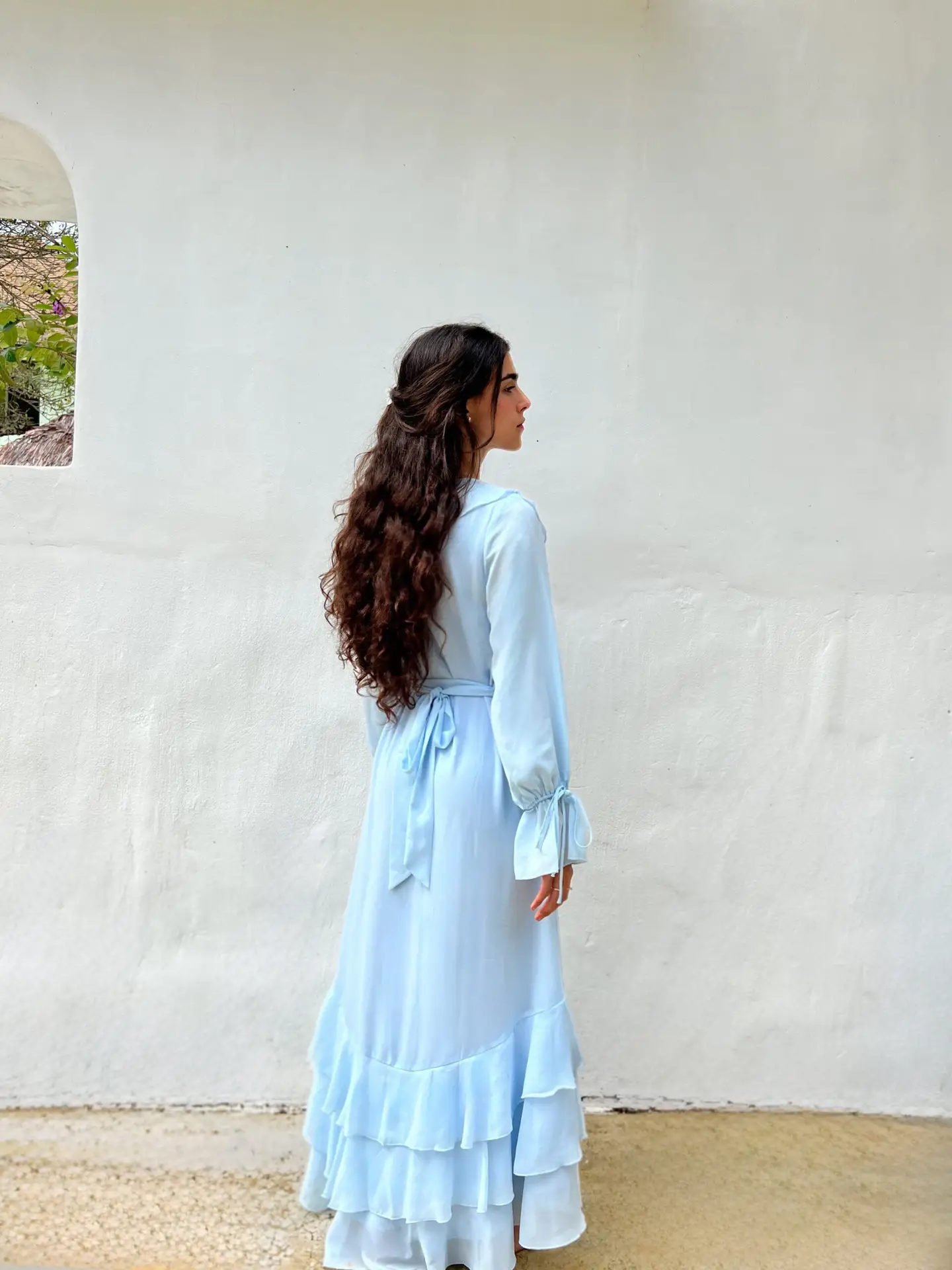 השמלה בגזרה משוחררת ונשפכת, עם מלמלות עדינות בחזה ובתחתית שמוסיפות תנועה ורוך, וקשירה יפהפייה בשרוולים.