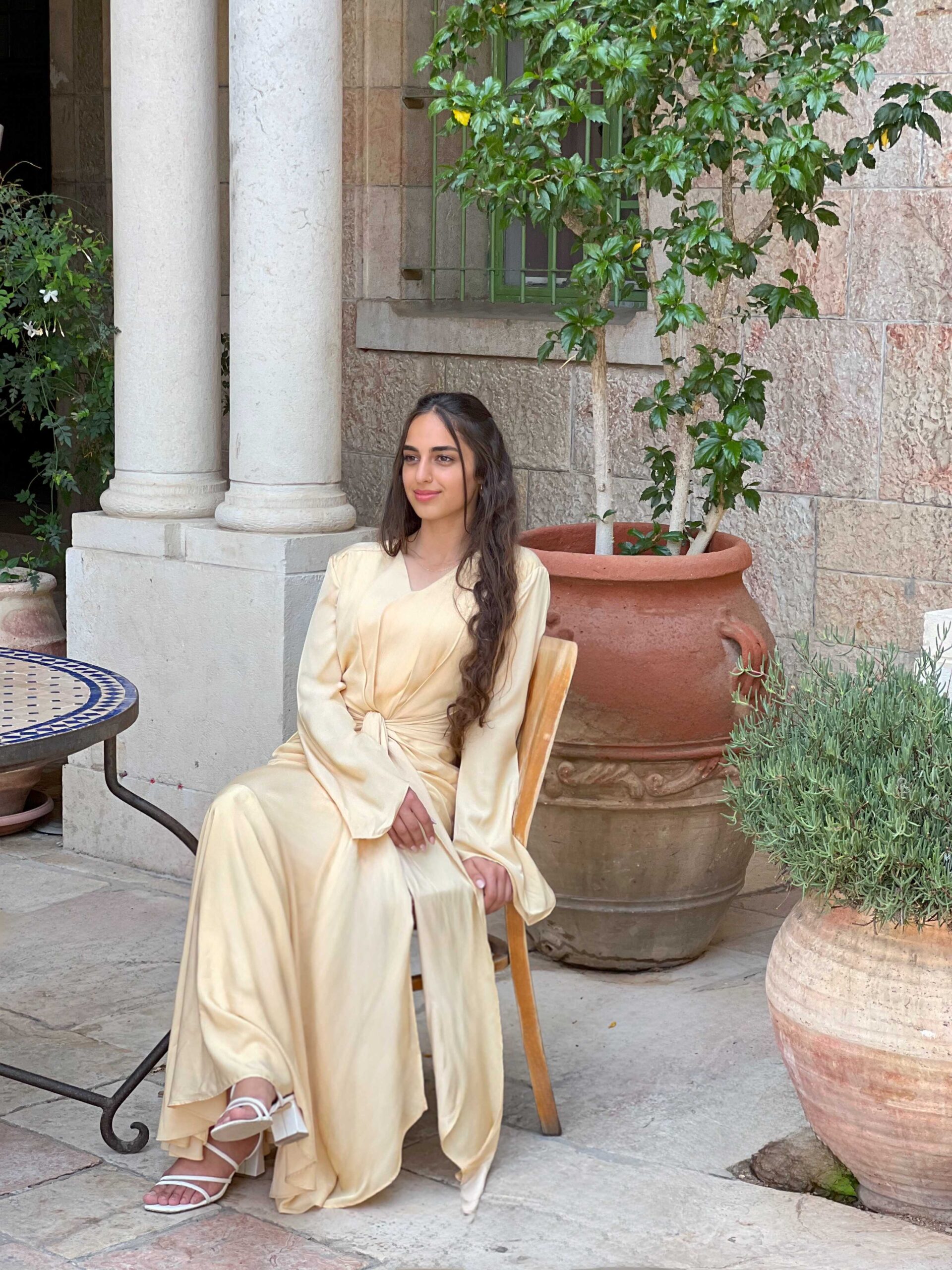 השמלה באורך מקסי , בעלת שרוולים ארוכים נשפכים , סרטי קשירה עבים משני צידי המותן , שיכולים להיקשר גם מלפנים וגם מאחור, וליצור מראה מגוון בכל פעם .