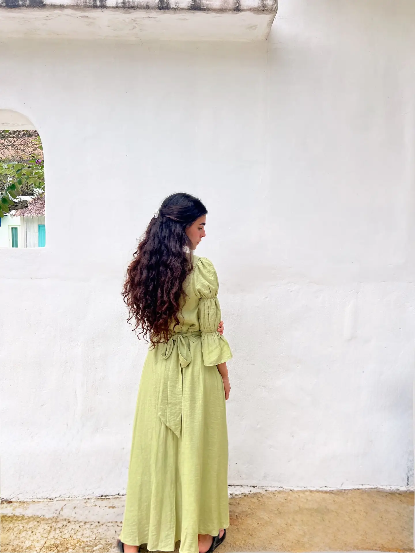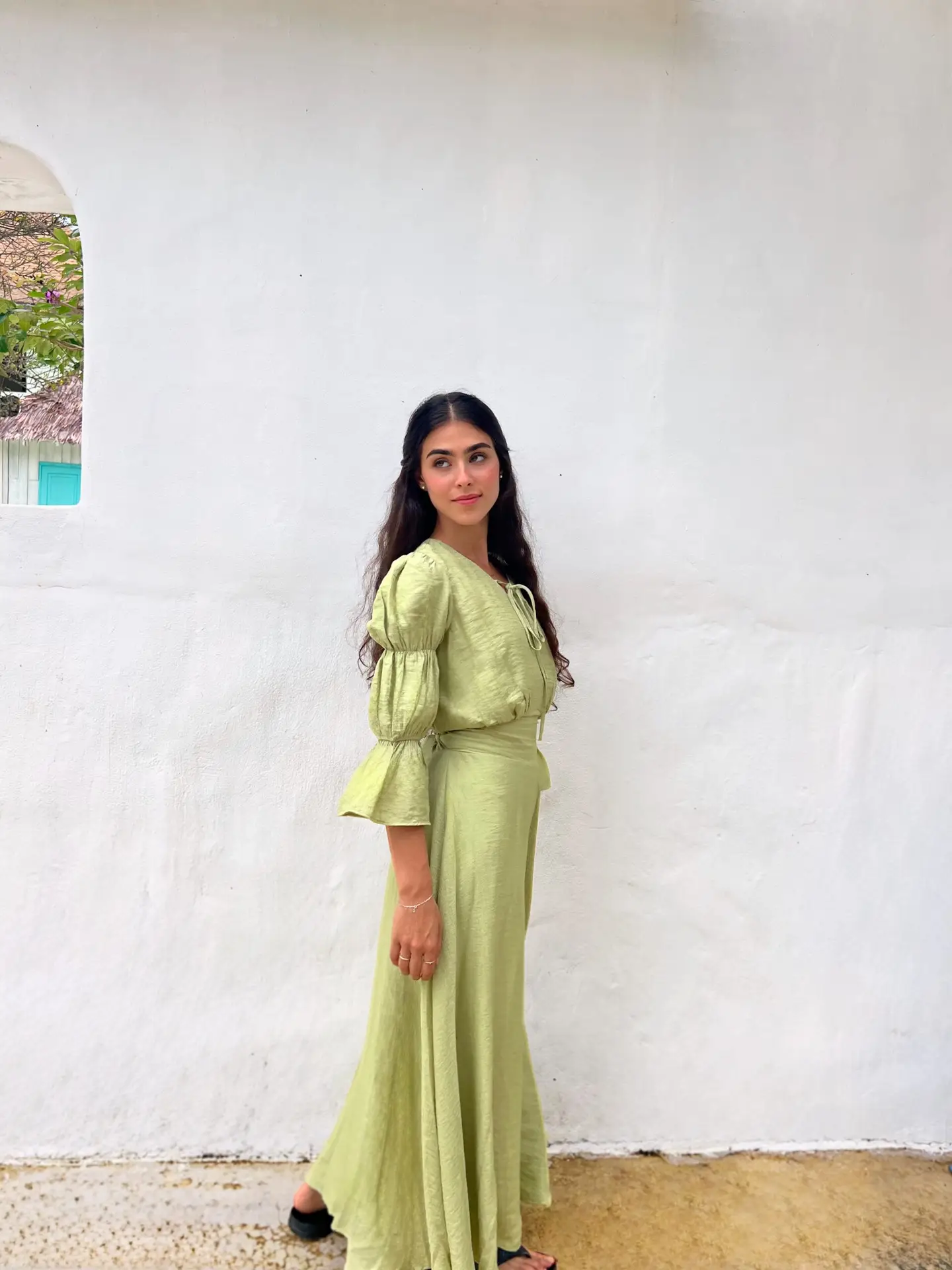 שמלה בעיצוב חלומי בצבע ירוק פסטל עם נגיעות ברק עדינות.