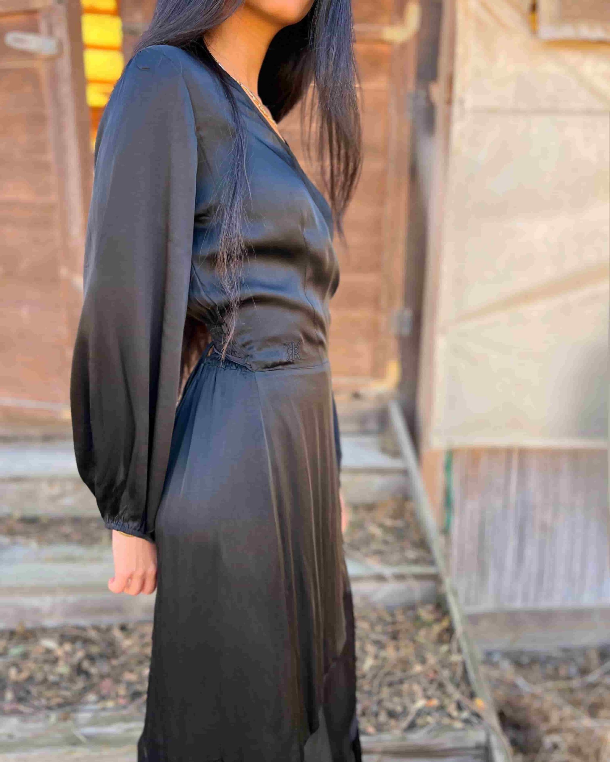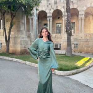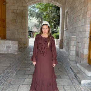 שמלת מעטפת חלומית , עשויה ברובה בד משי יוקרתי ונשפך , עם חוטי משי בסיומת השמלה למראה חגיגי .
